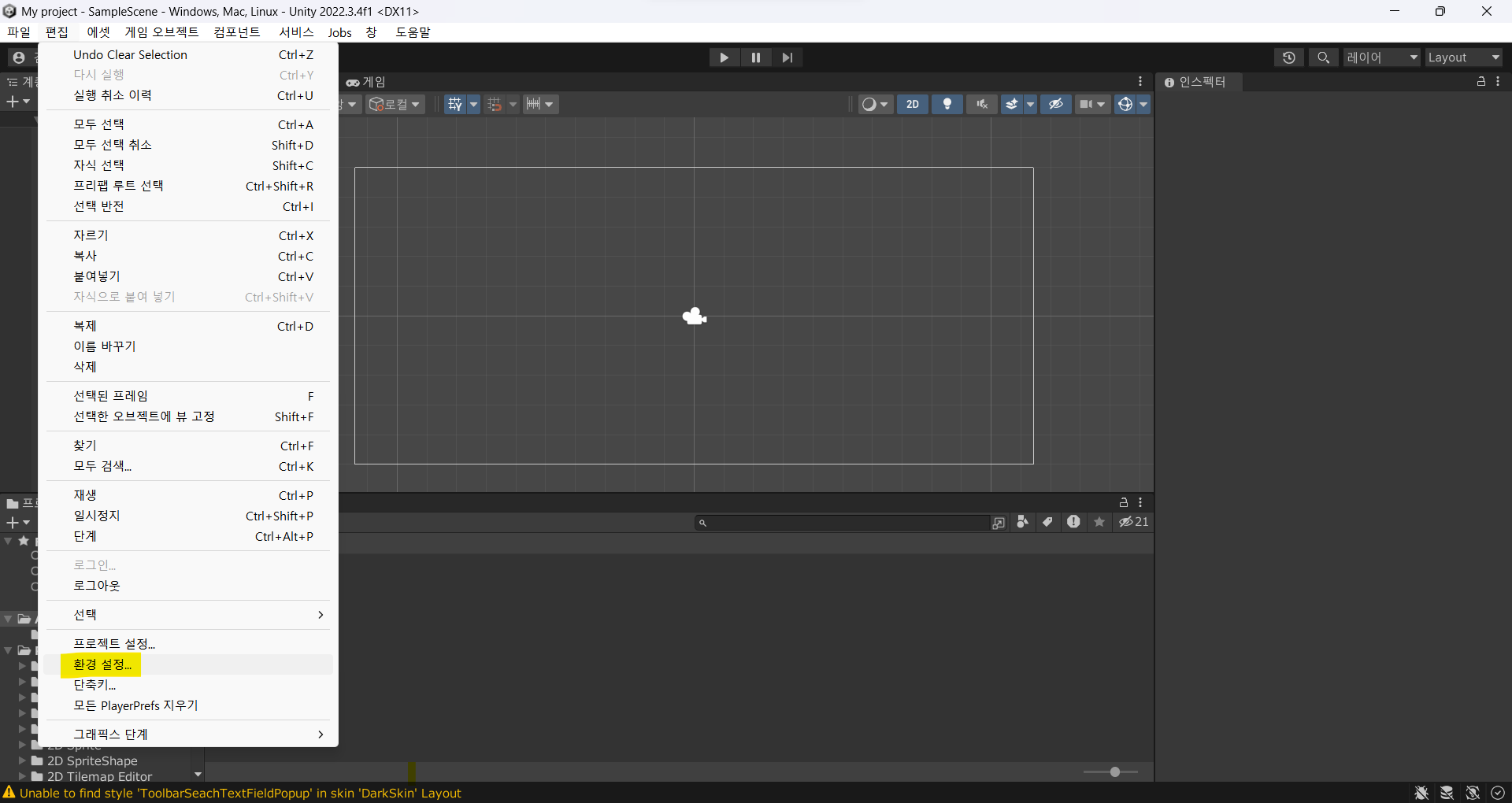 My project 클릭 프로젝트가 열렸다면, '편집' -> '환경 설정'을 눌러 설정창을 열어줍니다.