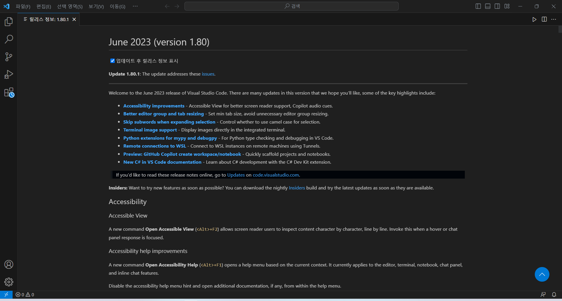 설치 완료 후 VIsual Studio Code를 실행했을 때 아래와 같은 창이 보이면 설치 완료입니다.